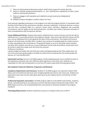 Professional Disposition and Conduct : The BSW program adheres to the NASW Code of Ethics . Students , faculty , and field placements are expected to practice ethically as determined by the Code of Ethics . The BSW program also has a list of expected behaviors and reasons for dismissal included in the program handbook .