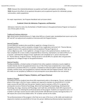 Internal Transfers Current GMercyU students who would like to apply for a change of major to Occupational Science , need to complete a change of major application and email it Dr . Thomas Mernar , Program Director of Occupational Science and Occupational Therapy Programs at mernar . t @ gmercyu . edu . To be eligible for a change of major to Occupational Science , students must have completed 24 or more credits at Gwynedd Mercy University , maintained a cumulative GPA of a 3.1 or greater , submitted the change of major application and completed an in- person interview with Dr . Thomas Mernar , Program Director . Having earned an overall GPA of or greater does not guarantee acceptance of a change of major to Occupational Science .