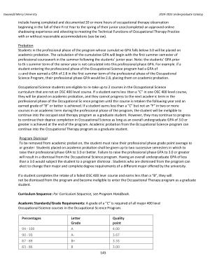 Probation Students in the professional phase of the program whose cumulative GPA falls below 3.0 will be placed on academic probation . The calculation of the cumulative GPA will begin with the first summer semester of professional coursework in the summer following the students ’ junior year . Note : the students ’ GPA prior to this summer term of the senior year is not calculated into this professional phase GPA . For example , if a student entering the professional phase of the Occupational Science program had a GPA of