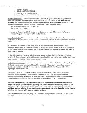 Additional expenses : Additional expenses that the student can incur are , health insurance , criminal background checks , child abuse clearance , health and physical clearances ( eg . annual flu shot , COVID , vaccination , TB / PPD , immunizations ), CPR certification ( Amercian Heart Association for Health Care providers ), uniform attire for clinical experience , transportation to the university and to clinical sites ( to include parking fees and tolls ), required program textbooks .