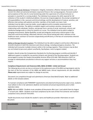Compliance Requirements and Clearances BSN , ABSN , & WBSN — Initial and Annual The following documents are due on entrance to the sophomore year of the BSN nursing program and , by the start of the first semester of the ABSN and WBSN tracks . Annual requirements are also identified . Please note requirements are subject to change at any time .