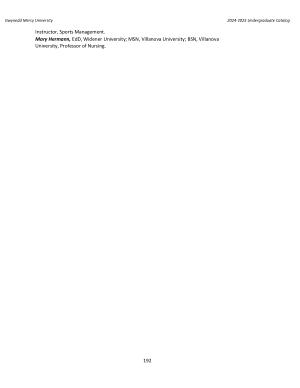 Instructor , Sports Management . Mary Hermann , EdD , Widener University ; MSN , Villanova University ; BSN , Villanova University , Professor of Nursing .