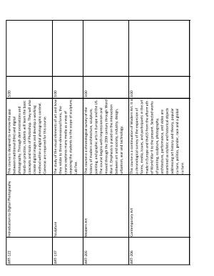 This course is a continuation of Modern Art . It is a chronological survey of the expansion of forms , media , issues , and participants in the art made in Europe and theUS from the aftermath of World War II to the present . Selected works of painting , sculpture , photography , architecture , performance , and video are examined as stylistic and historical objects addressing art history and theory , popular culture , politics , gender , race and a global culture . |