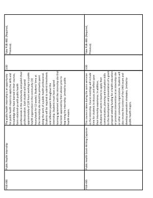 The public health internship is an opportunity for public health majors to apply the skills and knowledge they have learned in their courses , form relationships with public health professionals in the community and polish their professionalism . Each student will spend approximately of 120 hours working in a public health organization in the community ( 10 hours / week for 12 weeks ). Students ' time at the internship site should be primarily spent doing the work of a public health professional . Students will be required to submit timesheets and reflection papers throughout the internship . Students must have a signed learning agreement with the internship site that has been approved by their advisor prior to beginning the internship . Limited to public health majors . |