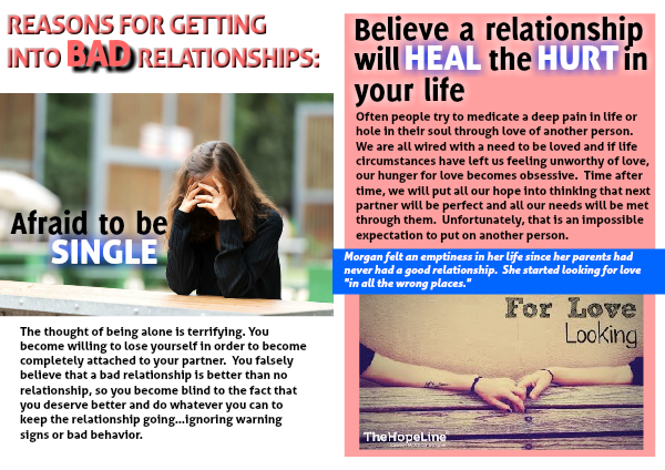 Often people try to medicate a deep pain in life or hole in their soul through love of another person. We are all wired with a need to be loved and if life circumstances have left us feeling unworthy of love, our hunger for love becomes obsessive. Time after time, we will put all our hope into thinking that next partner will be perfect and all our needs will be met through them. Unfortunately, that is an impossible expectation to put on another person.