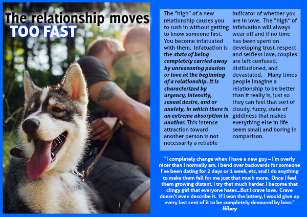 The “high” of a new relationship causes you to rush in without getting to know someone first. You become infatuated with them. Infatuation is the state of being completely carried away by unreasoning passion or love at the beginning of a relationship. It is characterized by urgency, intensity, sexual desire, and or anxiety, in which there is an extreme absorption in another. This intense attraction toward another person is not necessarily a reliable indicator of whether you are in love. The “high” of infatuation will always wear off and if no time has been spent on developing trust, respect and selfless love, couples are left confused, disillusioned, and devastated. Many times people imagine a relationship to be better than it really is, just so they can feel that sort of cloudy, fuzzy, state of giddiness that makes everything else in life seem small and boring in comparison.