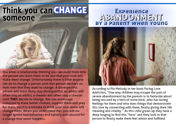 You enter a relationship thinking you can mold them into the person you want them to be and that your love will make them change. Unfortunately there is little anyone can do to change a person until that person decides on their own that they want to change. A disrespectful person will most likely stay disrespectful, an addict will often stay an addict, a cheater will often stay a cheater until THEY decide to change. You can encourage someone to make better choices, support them and pray for them, but it is a mistake to think your love alone will change them. When you understand this, you will no longer ignore bad behaviors and naively wait around for a change that never happens.