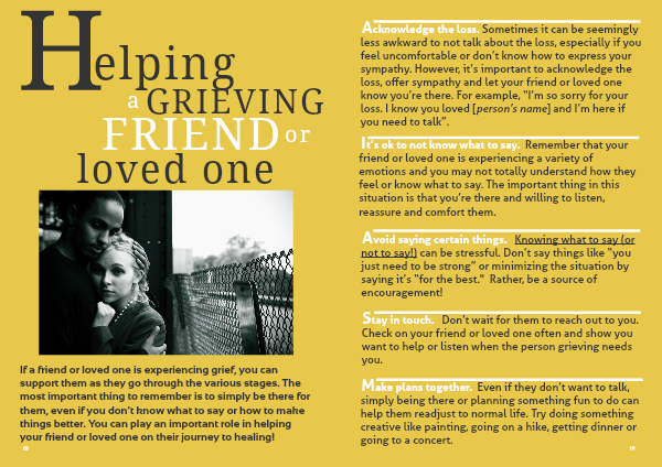 tay in touch. Don’t wait for them to reach out to you. Check on your friend or loved one often and show you want to help or listen when the person grieving needs you.