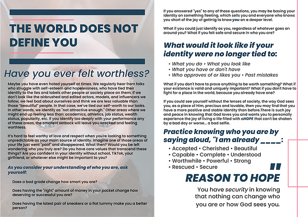 It’s hard to feel worthy of love and respect when you're looking to something unpredictable as your main source of identity. Imagine one of those areas of your life just went "poof" and disappeared. What then? Would you be left wondering who you truly are? Do you have core values that transcend these things? Are you confident in your identity without school, TikTok, your girlfriend, or whatever else might be important to you?