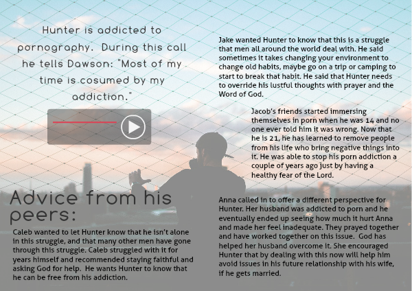 Anna called in to offer a different perspective for Hunter. Her husband was addicted to porn and he eventually ended up seeing how much it hurt Anna and made her feel inadequate. They prayed together and have worked together on this issue. God has helped her husband overcome it. She encouraged Hunter that by dealing with this now will help him avoid issues in his future relationship with his wife, if he gets married.