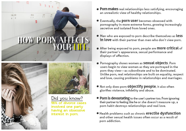 Pornography shows women as sexual objects. Porn users begin to view women as they are portrayed in the porn they view---as subordinate and to be dominated. Unlike porn, real relationships are built on equality, respect and love, causing problems in relationships and marriages.