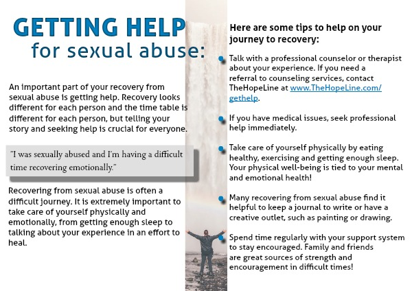 An important part of your recovery from sexual abuse is getting help. Recovery looks different for each person and the time table is different for each person, but telling your story and seeking help is crucial for everyone.