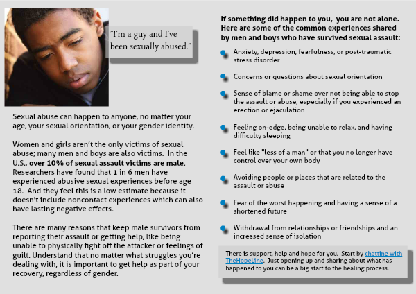 If something did happen to you, you are not alone. Here are some of the common experiences shared by men and boys who have survived sexual assault: