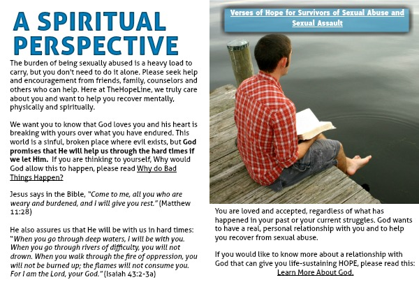 The burden of being sexually abused is a heavy load to carry, but you don't need to do it alone. Please seek help and encouragement from friends, family, counselors and others who can help. Here at TheHopeLine, we truly care about you and want to help you recover mentally, physically and spiritually.
