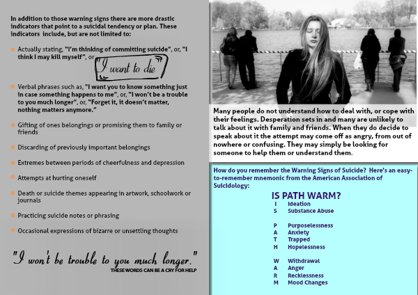 In addition to those warning signs there are more drastic indicators that point to a suicidal tendency or plan. These indicators include, but are not limited to: