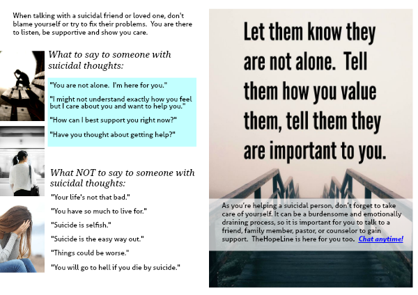 As you’re helping a suicidal person, don’t forget to take care of yourself. It can be a burdensome and emotionally draining process, so it is important for you to talk to a friend, family member, pastor, or counselor to gain support. TheHopeLine is here for you too. Chat anytime!