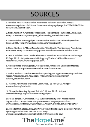 9. "Know the Warning Signs of Suicide." 11 Nov 2015. <http://www.suicidology.org/resources/warning-signs>.