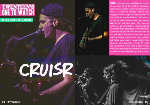 CRUISR, athre-partbandfromPhiladelphia, consists ofAndyStates, JonVanDine, andBrunoCatrambone. Thetrio’ smusiccouldbedescribedasindiepop / surf. Cruisrisabandthatdefinitelydeservesmore recognition. ThefirstsongIheardfromthemwas“ Al Over” andIwasimmediatelyhoked. Theirmusicis veryfunandupbeat, listeningtotheirsongsyoucan’ t helpbutmoveanddancealong. Theirsongsare perfectforadayonthebeachorroadtripingduring thesummer. WegotophotographCruisratheirshow inSanDiegothispastDecemberwhentheywereon tourwithAgainsttheCurent, andtheywerejustas godandenergeticonstageastheirsongsoniTunes andYouTubewouldsugest. Iwoulddefinitleycheck theseguysoutifyouarefansofPasionPit, Forthe Foxes, orThe1975, astheirsoundissimilartothose bands( inmyopinion) buttheydefinitelydostandout asuniqueandareabandyouhavegotowatchoutfor.