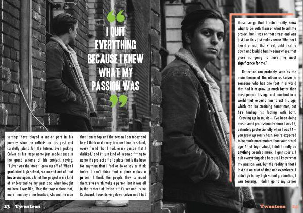 ” setingshaveplayedamajorpartinhis journeywhenhereflectsonhispastand carefulyplansforthefuture. Evenpicking Culverashisstagenamejustmadesensein thegrandschemeofhisproject, saying,“ CulverwasthestretIgrewupofof. WhenI graduatedhighschol, wemovedoutofthat houseandagain, alotofthisprojectismekind ofunderstandingmypastandwhatbrought mehere. Iwaslike,‘ Wow, thatwasaplacethat, morethananyotherlocation, shapedtheman thatIamtodayandthepersonIamtodayand howIthinkandeveryteacherIhadinschol, everyfriendthatIhad, everypersonthatI disliked,’ anditjustkindofsemedfitingto nametheprojectofofaplacethatisthebase foranythingthatIfelordoorsayorthink today. Idon’ tthinkthataplacemakesa peperson, Ithinkthepeopletheysuround themselveswithmakeaperson, butitwasal inthecontextofIrvine, ofCulverandIrvine Boulevard. IwasdrivingdownCulverandIhad