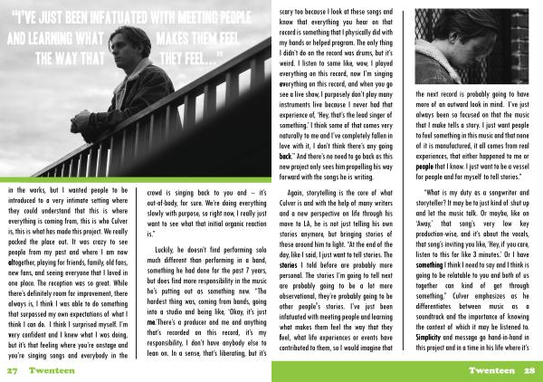 intheworks, butIwantedpeopletobe introducedtoaveryintimatesetingwhere theycouldunderstandthatthisiswhere everythingiscomingfrom, thisiswhoCulver is, thisiswhathasmadethisproject. Werealy packedtheplaceout. Itwascrazytose peoplefrommypastandwhereIamnow altogether, playingforfriends, family, oldfans, newfans, andseingeveryonethatIlovedin oneplace. Thereceptionwassogreat. While there’ sdefinitelyromforimprovement, there alwaysis, IthinkIwasabletodosomething thatsurpasedmyownexpectationsofwhatI thinkIcando. IthinkIsurprisedmyself. I’ m veryconfidentandIknewwhatIwasdoing, butit’ sthatfelingwhereyou’ reonstageand you’ resingingsongsandeverybodyinthe
