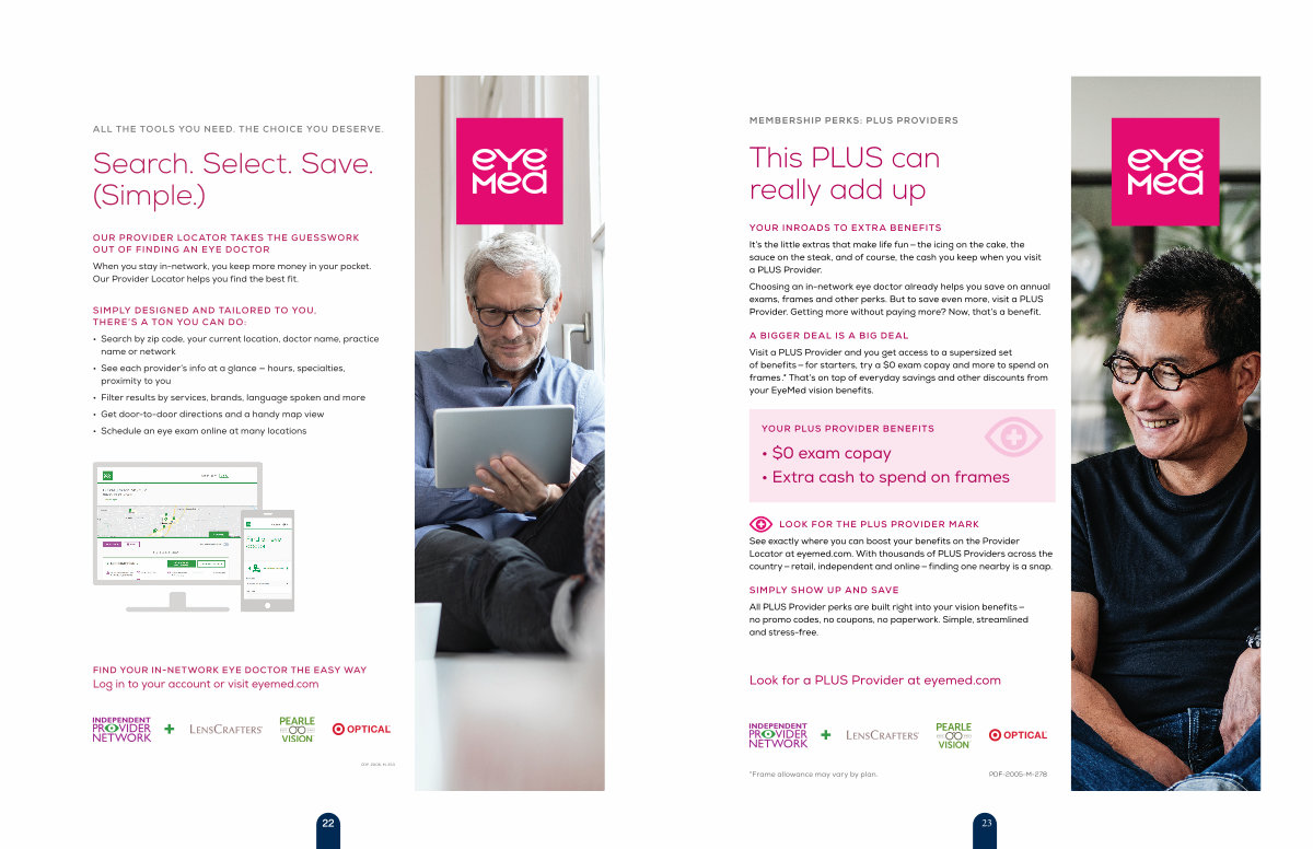 Visit a PLUS Provider and you get access to a supersized set of benefits— for starters, try a $ 0 exam copay and more to spend on frames.* That’ s on top of everyday savings and other discounts from your EyeMed vision benefits.