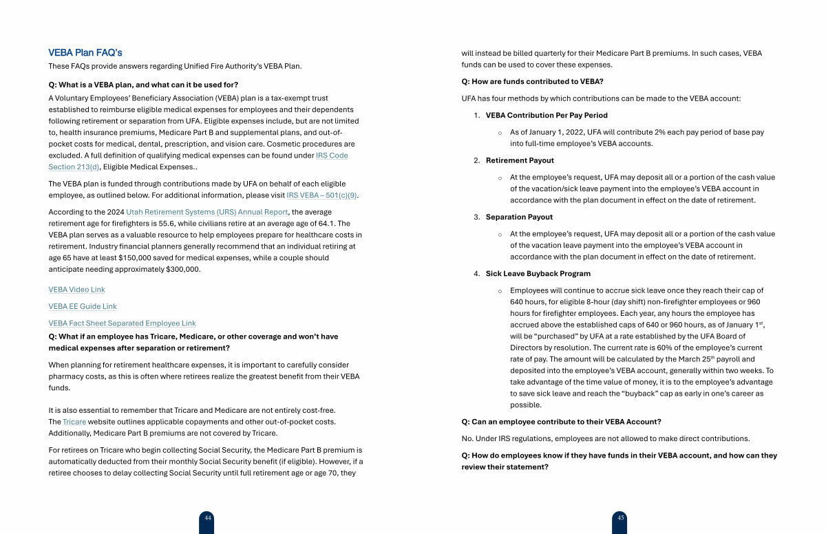 As of January 1, 2022, UFA will contribute 2 % each pay period of base pay into full-time employee’ s VEBA accounts.