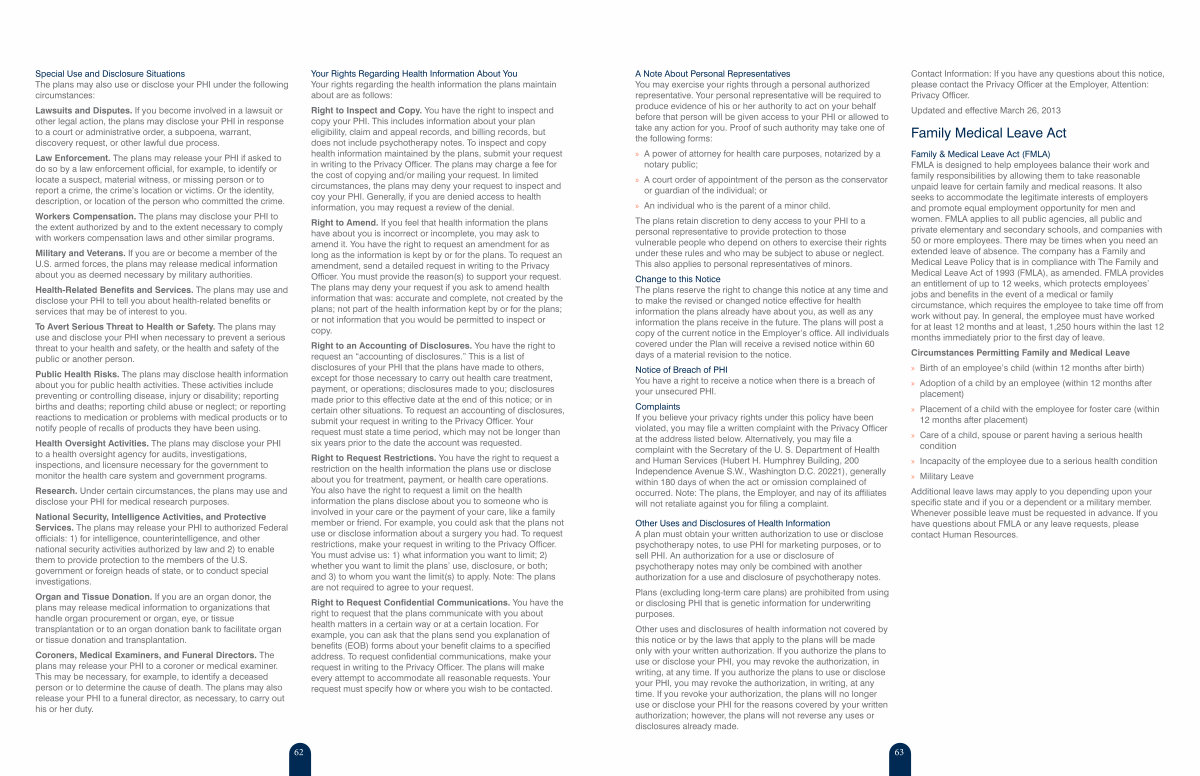 Change to this Notice The plans reserve the right to change this notice at any time and to make the revised or changed notice effective for health information the plans already have about you, as well as any information the plans receive in the future. The plans will post a copy of the current notice in the Employer’ s office. All individuals covered under the Plan will receive a revised notice within 60 days of a material revision to the notice.