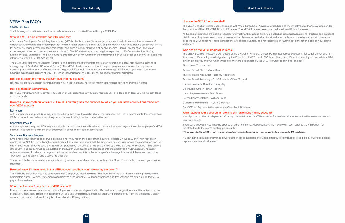 Updated April 2022 The following information is meant to provide an overview of Unified Fire Authority’ s VEBA Plan.