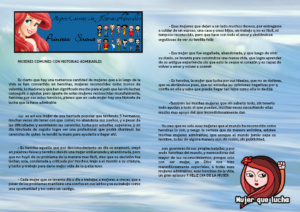 Es cierto que hay una numerosa cantidad de mujeres que a lo largo de la vida se han convertido en heroínas, mujeres reconocidas como iconos de valentía, luchadoras y que han significado mucho para el país que las vio luchar, conseguir, o ayudar, pero aparte de estas mujeres reconocidas mundialmente, famosas por sus actos heroicos, pienso que en cada mujer hay una historia de lucha que la hace admirable