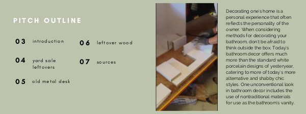 PITCH OUTLINE 03 introduction 06 leftover wood 04 yard sale 07 sources leftovers 05 old metal desk