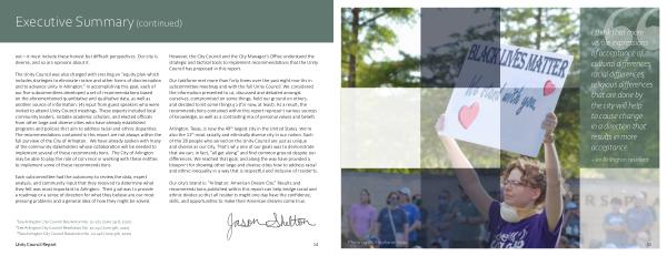 The Unity Council was also charged with creating an “ equity plan which includes strategies to eliminate racism and other forms of discrimination and to advance unity in Arlington .” In accomplishing this goal , each of our five subcommittees developed a set of recommendations based on the aforementioned quantitative and qualitative data , as well as another source of information : ( 4 ) input from guest speakers who were invited to attend Unity Council meetings . These experts included local community leaders , notable academic scholars , and elected officials from other large and diverse cities who have already established programs and policies that aim to address racial and ethnic disparities . The recommendations contained in this report are not always within the full purview of the City of Arlington . We have already spoken with many of the community stakeholders whose collaboration will be needed to implement several of these recommendations . The City of Arlington may be able to play the role of convenor in working with these entities to implement some of these recommendations .
