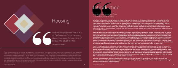It has been my honor and privilege to serve the City of Arlington as the Chair of the Unity Council ’ s Subcommittee on Housing . My fellow committee members and I devoted countless hours meeting with , and hearing from experts in the housing field , reviewing reports , and conferring with one another to develop a set of recommendations to make Arlington a more equitable city . Our subcommittee ’ s diversity included representation from various ages , races , political ideologies , educational backgrounds , and occupations . Despite holding contrasting viewpoints , we were able to work together , and managed to develop camaraderie . There were many spirited debates and our recommendations are better because of them . Our final work product is one that contains contributions from , and has the support of , each of our committee members .
