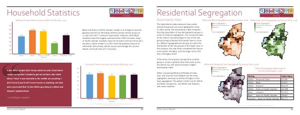 Black and Asian or Pacific Islander residents of Arlington have the greatest amount of individuals without private vehicle access at 5.9 percent and 5.7 percent respectively . However , while Black residents have the longest commute times ( 29.6 minutes ), Asian or Pacific Islander residents have the shortest commute time ( 26.5 minutes ). Latino residents in 2017 have the greatest amount of individuals with private vehicle access and average the second lowest commute time ( 27.2 minutes ). |