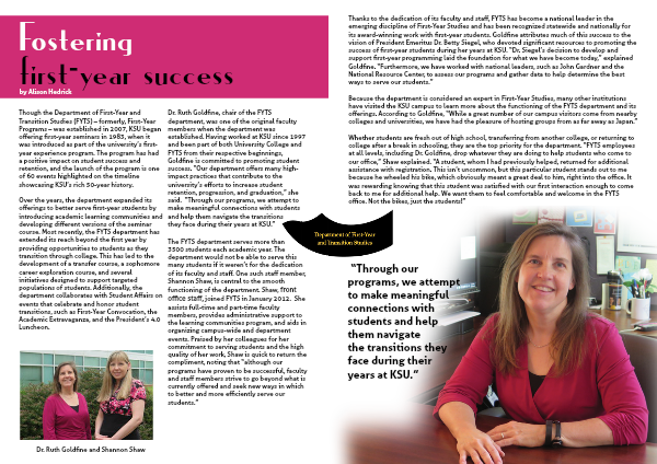 Thanks to the dedication of its faculty and staff, FYTS has become a national leader in the emerging discipline of First-Year Studies and has been recognized statewide and nationally for its award-winning work with first-year students. Goldfine attributes much of this success to the vision of President Emeritus Dr. Betty Siegel, who devoted significant resources to promoting the success of first-year students during her years at KSU. “Dr. Siegel’s decision to develop and support first-year programming laid the foundation for what we have become today,” explained Goldfine. “Furthermore, we have worked with national leaders, such as John Gardner and the National Resource Center, to assess our programs and gather data to help determine the best ways to serve our students.”