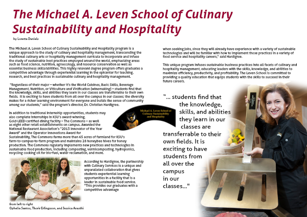 The Michael A. Leven School of Culinary Sustainability and Hospitality program is a unique approach to the study of culinary and hospitality management, transcending the traditional culinary arts or hospitality management curricula to incorporate and infuse the study of sustainable best practices employed around the world, emphasizing areas such as food science, nutrition, agroecology, and resource conservation as well as essential business skills/abilities. This highly relevant degree program offers graduates a competitive advantage through experiential learning in the epicenter for teaching, research, and best practices in sustainable culinary and hospitality management.