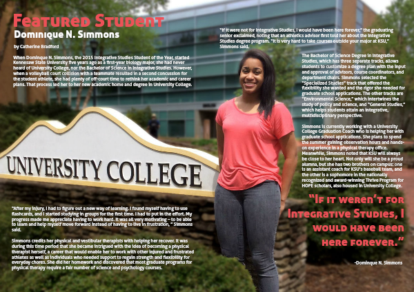 When Dominque N. Simmons, the 2015 Integrative Studies Student of the Year, started Kennesaw State University five years ago as a first-year biology major, she had never heard of University College, nor the Bachelor of Science in Integrative Studies. However, when a volleyball court collision with a teammate resulted in a second concussion for the student athlete, she had plenty of off-court time to rethink her academic and career plans. That process led her to her new academic home and degree in University College.