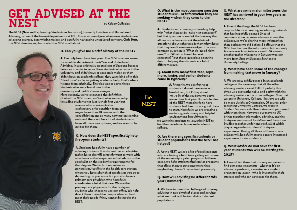 A. I’ve only been here two years. The NEST is a new name for an older department: First-Year and Undeclared Advising. It was originally created out of Student Success Services in order to serve those students who came to the university and didn’t have an academic major, so they didn’t have an academic college; they were kind of in this “dead zone” as far as getting academic help. That’s where it came from originally. The idea was to serve those students who were brand new to the