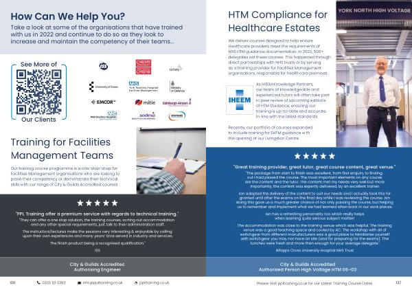 We deliver courses designed to help ensure Healthcare providers meet the requirements of NHS HTM guidance documentation . In 2022 , 500 + delegates sat these courses . This happened through direct partnerships with NHS trusts or by serving as a training provider for Facilities Management organisations , responsible for healthcare premises .