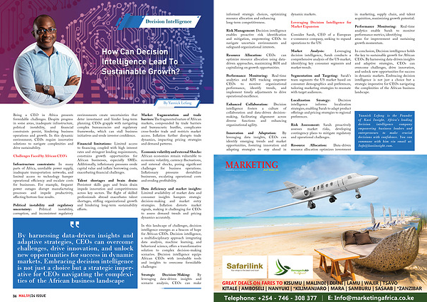 In conclusion , Decision intelligence holds the key to sustainable growth for African CEOs . By harnessing data-driven insights and adaptive strategies , CEOs can overcome challenges , drive innovation , and unlock new opportunities for success in dynamic markets . Embracing decision intelligence is not just a choice but a strategic imperative for CEOs navigating the complexities of the African business landscape .