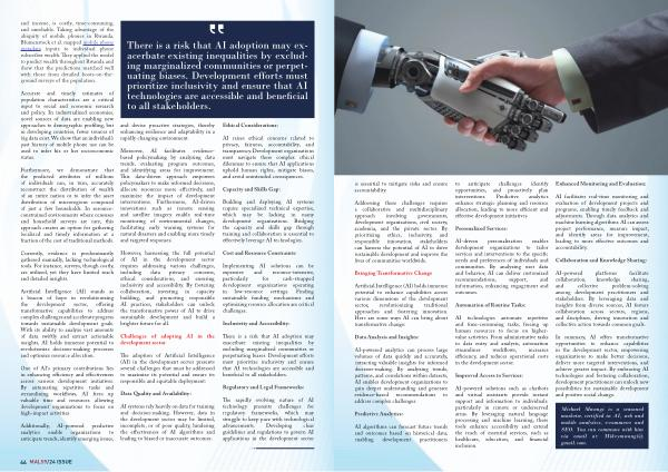 However , harnessing the full potential of AI in the development sector requires addressing various challenges , including data privacy concerns , ethical considerations , and ensuring inclusivity and accessibility . By fostering collaboration , investing in capacity building , and promoting responsible AI practices , stakeholders can unlock the transformative power of AI to drive sustainable development and build a brighter future for all .