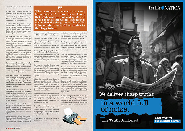 The churches in Kenya had become propaganda platforms for the politician and the churches had in the process lost all moral authority and their role as the arbiters of right and wrong was in serious jeopardy .