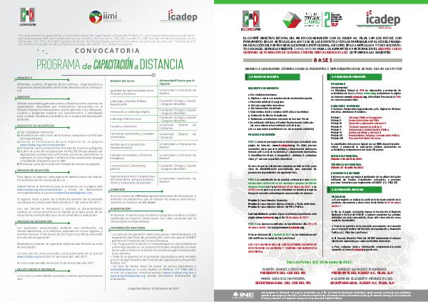El Comité Directivo Estatal del PRI en coordinación con el ICADEP A. C. Filial San Luis Potosí, con fundamento en los artículos 204, 205 y 206 de los Estatutos y en los numerales 407 al 413 del Programa de Acción del Partido Revolucionario Institucional, así como en los artículos 6 y 7 de sus Estatutos Sociales, expide la presente CONVOCATORIA para los aspirantes a participar, en el Segundo Curso Ordinario de Formación de Cuadros Jóvenes Priístas ejercicio 2017, conforme a las siguientes: �