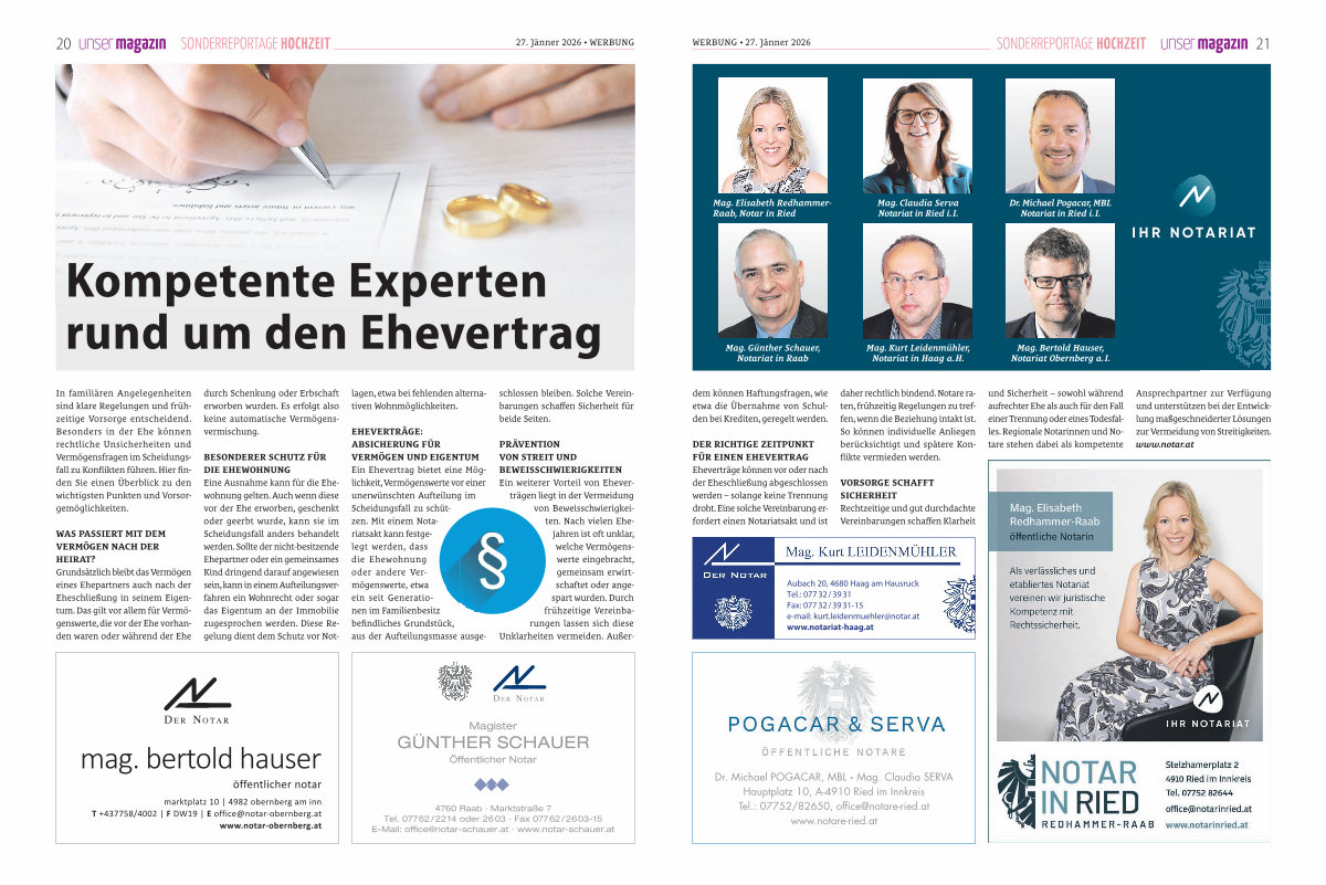 EHEVERTRÄGE: ABSICHERUNG FÜR VERMÖGEN UND EIGENTUM Ein Ehevertrag bietet eine Möglichkeit, Vermögenswerte vor einer unerwünschten Aufteilung im Scheidungsfall zu schützen. Mit einem Notariatsakt kann festgelegt werden, dass die Ehewohnung oder andere Vermögenswerte, etwa ein seit Generationen im Familienbesitz befindliches Grundstück, aus der Aufteilungsmasse ausgeschlossen