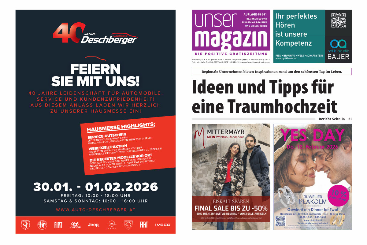 Woche 05 / 2026 • 27. Jänner 2026 • Telefon + 43( 0) 77 52 / 836 65 • www. unsermagazin. at Österreichische Post AG • RM 91A491002 K • 4910 Ried i. I. • www. diepositivegratiszeitung. at