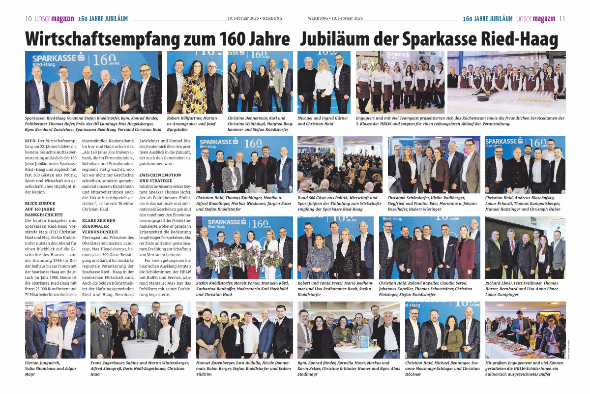 RIED. Der Wirtschaftsempfang am 22. Jänner bildete die bestens besuchte Auftaktveranstaltung anlässlich des 160 Jahre Jubiläums der Sparkasse Ried- Haag und zugleich mit fast 500 Gästen aus Politik, Sport und Wirtschaft ein gesellschaftliches Highlight in der Region.