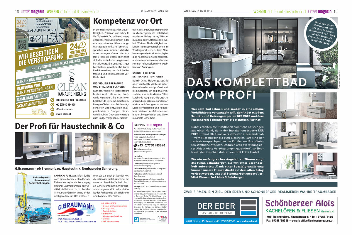 ANDRICHSFURT. Wer auf der Suche nach einem kompetenten Partner für Brunnenbau, Sondenbohrungen, Heizungs-, Wärmepumpen- oder Sanitärinstallationen ist, ist bei der G. Braumann GesmbH genau an der richtigen Adresse. Das Unternehmen, das u. a. einen 24 Stunden Notdienstservice bietet, ist immer am neuesten Stand der Technik. Auch als Generalunternehmer für Badsanierungen und Schwimmbäder ist der Fachbetrieb ein erfahrener und kompetenter Partner.