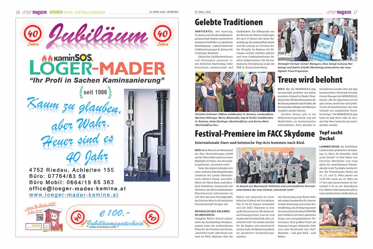 Bühne und verspricht ein musikalisches Erlebnis der Extraklasse. Von 27. bis 29. August verwandelt sich der FACC Skydome in eine große Konzertarena. Mit einem abwechslungsreichen Line-up und modernster Eventtechnik setzt „ Innviertel rockt“ ein starkes Zeichen für die Region und unterstreicht einmal mehr die Bedeutung Rieds als attraktiven Veranstaltungsstandort.