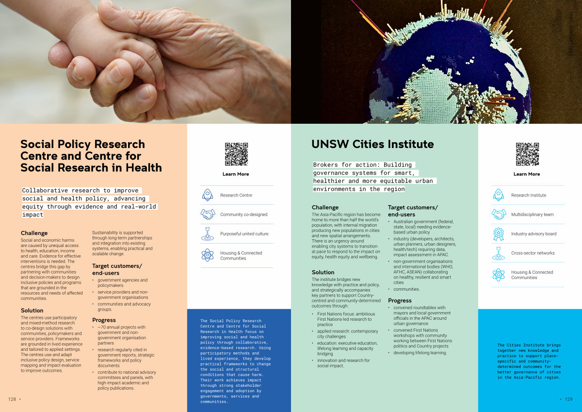 The Social Policy Research Centre and Centre for Social Research in Health focus on improving social and health policy through collaborative, evidence-based research. Using participatory methods and lived experience, they develop practical frameworks to change the social and structural conditions that cause harm. Their work achieves impact through strong stakeholder engagement and adoption by governments, services and communities.