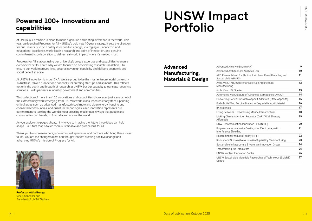 This collection of more than 100 innovations and capabilities showcases just a snapshot of the extraordinary work emerging from UNSW’ s world-class research ecosystem. Spanning critical areas such as advanced manufacturing, climate and clean energy, housing and connected communities, and quantum technologies, each innovation represents our commitment to tackling the world’ s most pressing challenges in ways that people and communities can benefit, in Australia and across the world.