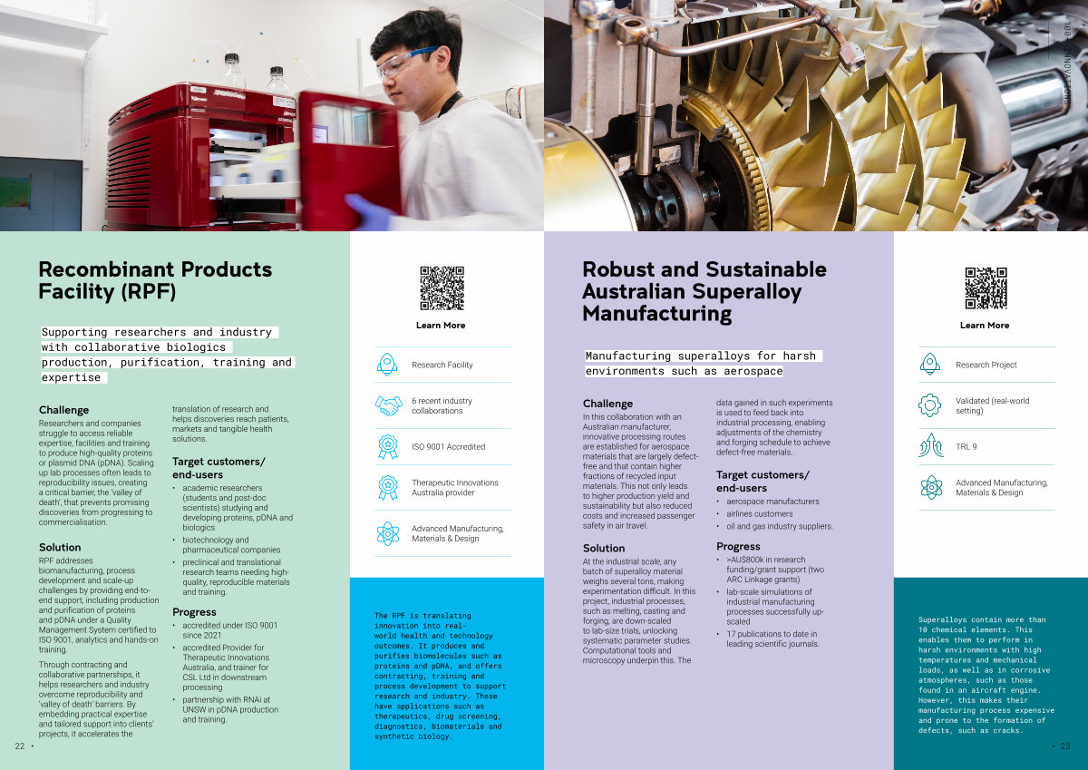 The RPF is translating innovation into realworld health and technology outcomes. It produces and purifies biomolecules such as proteins and pDNA, and offers contracting, training and process development to support research and industry. These have applications such as therapeutics, drug screening, diagnostics, biomaterials and synthetic biology.